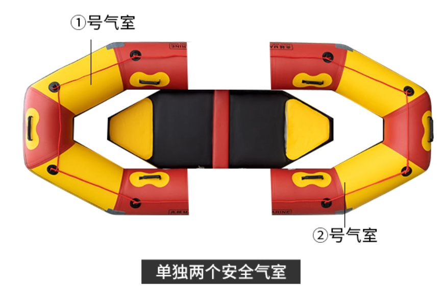 优质漂流船:合格的漂流船应有2个及以上的气室,当其中一个气室有漏气的情况,另外的气室不被影响,能够提供浮力保证船上人员的安全。