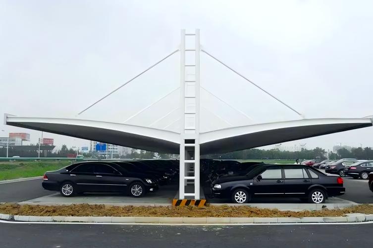 常见的膜结构车棚造型包括单边悬挑7字形、双边悬挑、拱形、尖顶、脊谷峰形等多种造型设计。下面根据不同的应用场景介绍几款经典的造型。