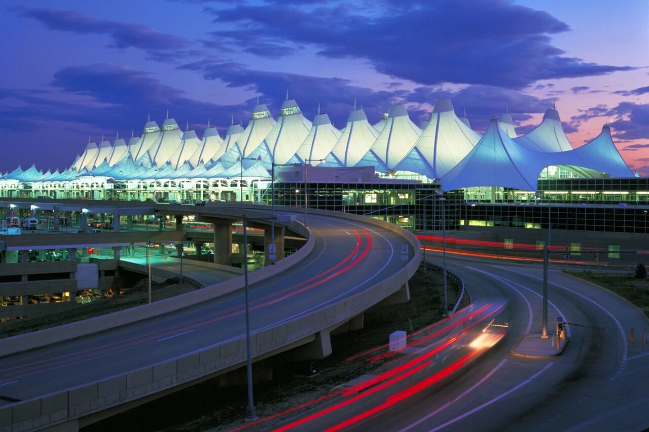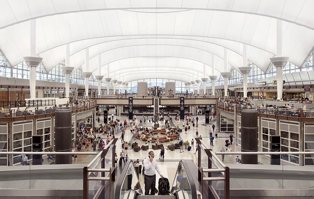 这座机场最令人难忘的是候机厅34顶PTFE膜材构成的"雪山帐篷"。设计师从落基山脉获得灵感,用特氟龙涂层玻璃纤维膜模拟雪峰轮廓。