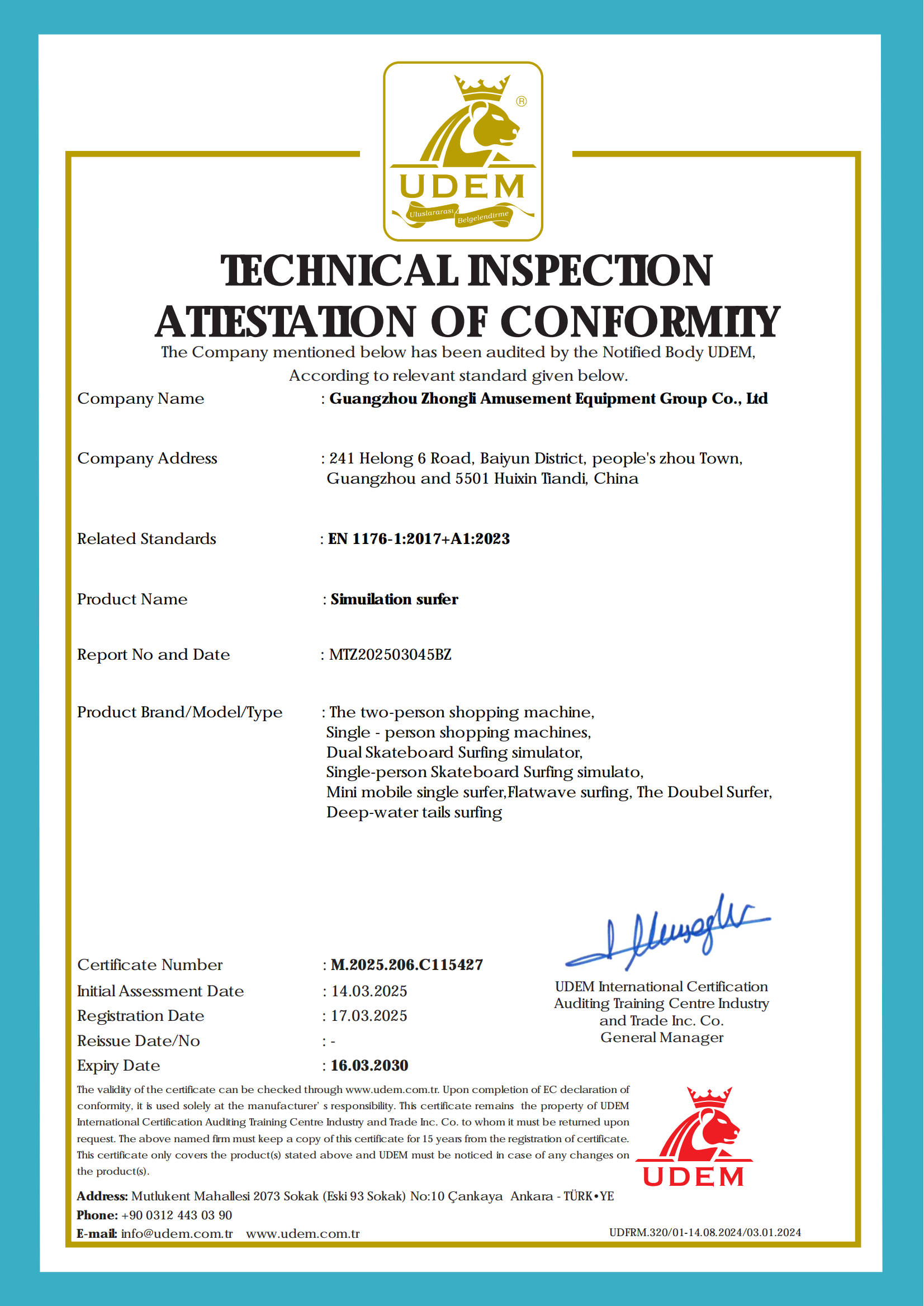 产品进入国际市场,首重资质。我们拥有冲浪模拟器 CE 认证证书。CE 认证作为欧盟市场的准入门槛,是产品安全、环保、性能符合国际标准的核心背书,能够极大简化了清关流程,顺利进入欧盟各国市场。