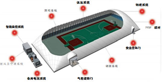 2.配套系统:气膜结构的配置通常主要有外膜、内膜、保温系统、智能自控系统、新风系统、备用电源系统、锚固系统、钢缆系统,室内照明系统、通道门系统,空调系统等等。