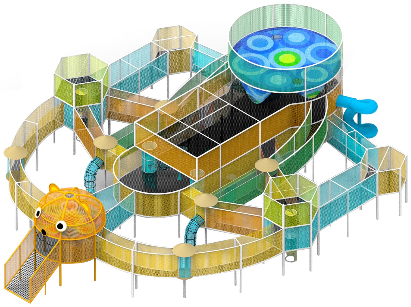 丛林魔网的核心是依托树木搭建悬空网状游乐空间,丛林魔网的结构分为网体、支撑结构、防护系统、连接件及配套设施五大部分,选材需同时满足安全承重、耐候抗老化、环保无损伤、低维护成本四大原则。